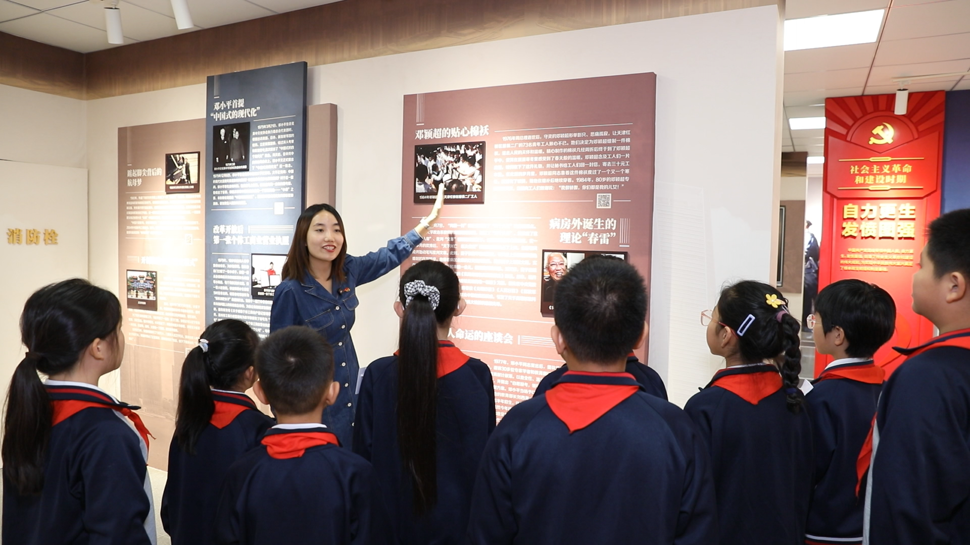小学学段由北辰区北仓小学刘洪宇老师负责,她从具象化的党徽入手,以生动形象的语言先后讲述了实验室中所展陈的不同历史时期的六个党史故事,让小学生们对党有了初步印象,接着通过启发式引导让学生们明白了自己小小的行动就是对党的大大支持,最后在激昂的《中国少年先锋队队歌》声中结束了此次实践研学。