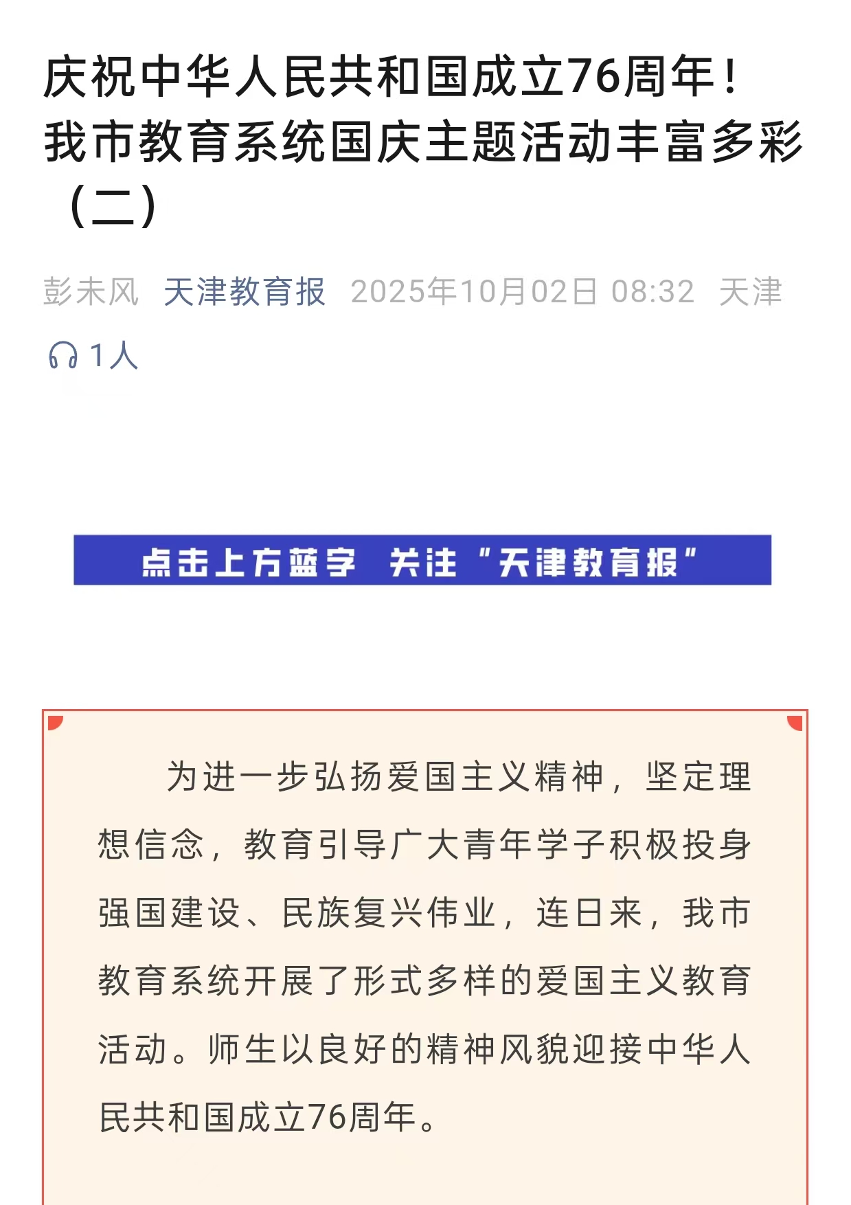 10月2日,天津教育报微信公众号报道学校国庆主题活动。 10月1日清晨,天津商业大学举行“青春献华诞 奋进新征程”庆祝中华人民共和国成立76周年升旗仪式。