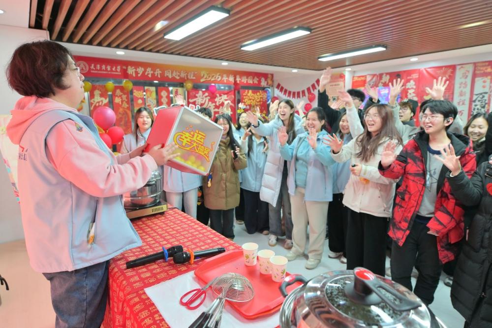 “慢点转!方向反了!”在一片欢笑与惊呼声中,挑战蒙眼 “尖叫鸡”的同学惹得围观人群前仰后合。几步之遥,投壶区却一片凝神静气,箭矢入壶的清脆声响不时引来喝彩。12月30日下午, 天津商业大学“一站式”学生社区与微渡众创空间内处处弥漫着热烈而浓厚的节庆氛围,化身为一座融汇传统文化的“新年乐园”,由该校党委学工部举办的学校第二届“新岁序开 同赴新程”新年游园会在此热烈开展,共吸引超过800名师生参与。