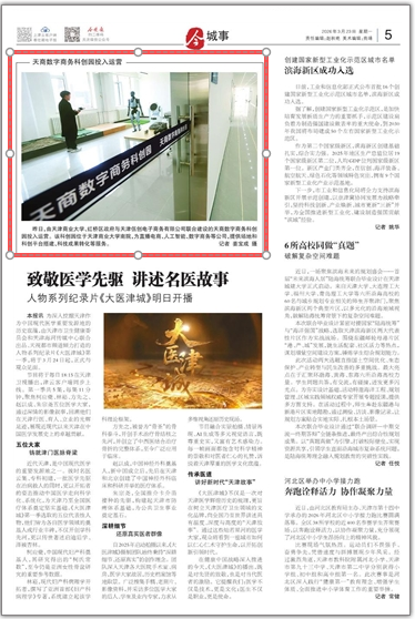 3月23日,《今晚报》报道我校天商数字商务科创园投入运营。昨日,由天津商业大学、红桥区政府与天津伍创电子商务有限公司联合建设的天商数字商务科创园投入运营。该科创园位于天津商业大学南院,为直播电商、人工智能、数字商务等公司,提供场地和科创平台搭建、科技成果转化等服务。